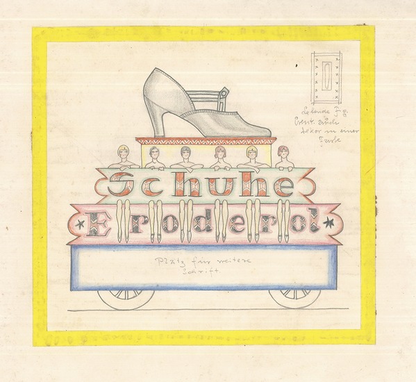 Schuhe Eroderol. Wien [ca. 1922]. Kolorierte Bleistiftzeichnungen auf Papier, auf Karton montiert. 22 x 23, 5 cm. (Blattgr.); 33, 5 x 46 cm. (Gesamtgr.). Karton u. Papier etwas gebräunt. vgl. Nebehay/Krug, Remigius Geyling. Künstler u. Literaten gezeichnet in Wien um 1900, 1974 - Wohl Werbe-Entwurf für ein Schuhgeschäft, unten rechts gestempelt: "Geyling und Kunz, Wien, I. Uraniastrasse 4". Die Firma "Geyling und Kunz" wurde 1921 ins Handelsregister aufgenommen (Wiener Zeitung, 21. August 1921). Zwei Felder in der Entwurfszeichnung als Platzhalter freigelassen "Platz für weitere Schrift". Remigius Geyling (1878-1974), war ein österreichischer Maler, Architekt und Bühnenbildner. In den Jahren 1922 bis 1945 war er Ausstattungschef des Burgtheaters. Geyling fertigte u. a. auch Stoffmusterentwürfe für die Firma Backhausen in den Jahren 1910-1922 an.